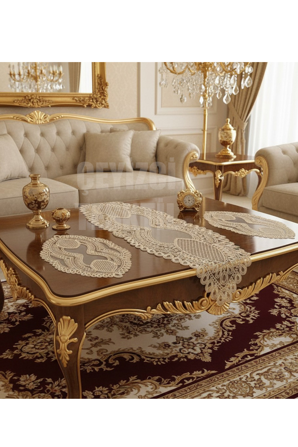 Salon Takımı, Yatak Odası 3 Parça Sehpa Örtüsü, Masa Örtüsü 3 Parça Oda Takımı – Gold Simli