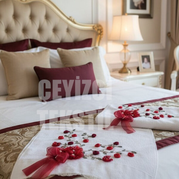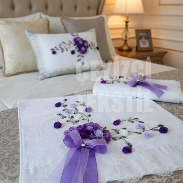 Kadife Çeyizlik Havlu, Nişan Havlusu Kadife Kurdelalı, Kurdele İşi Dantelli Havlu