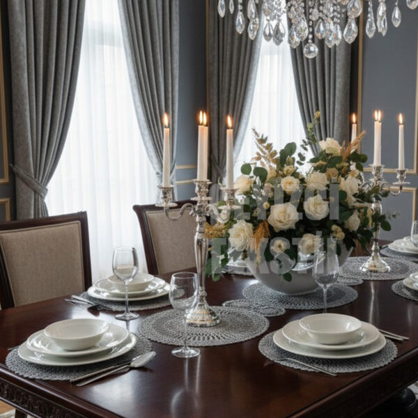 Gümüş Kordone Nakışlı Modern Amerikan Servis Supla Ve Runner 6 Kişilik Set