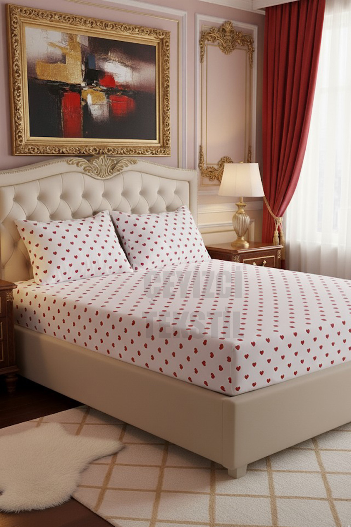 Pamuklu Kalp Desen Lastikli Çarşaf Takımı – 1 ADET YASTIK KILIFLI