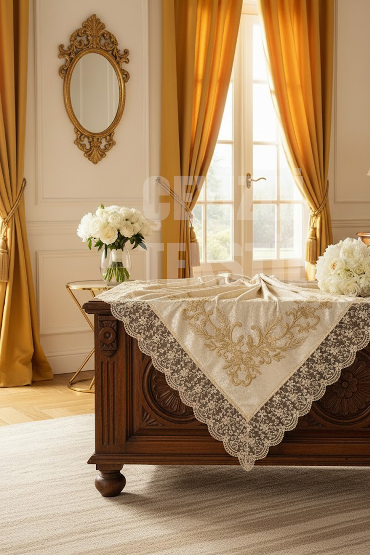 Fransız Güpürlü Işlemeli, Çeyizlik Saten Lüks Bohça, Nişan Bohçası