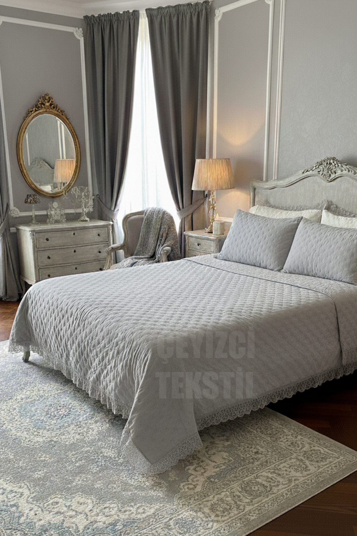 FRK - GRİ - DANTELLİ YATAK ÖRTÜSÜ ÇİFT KİŞİLİK