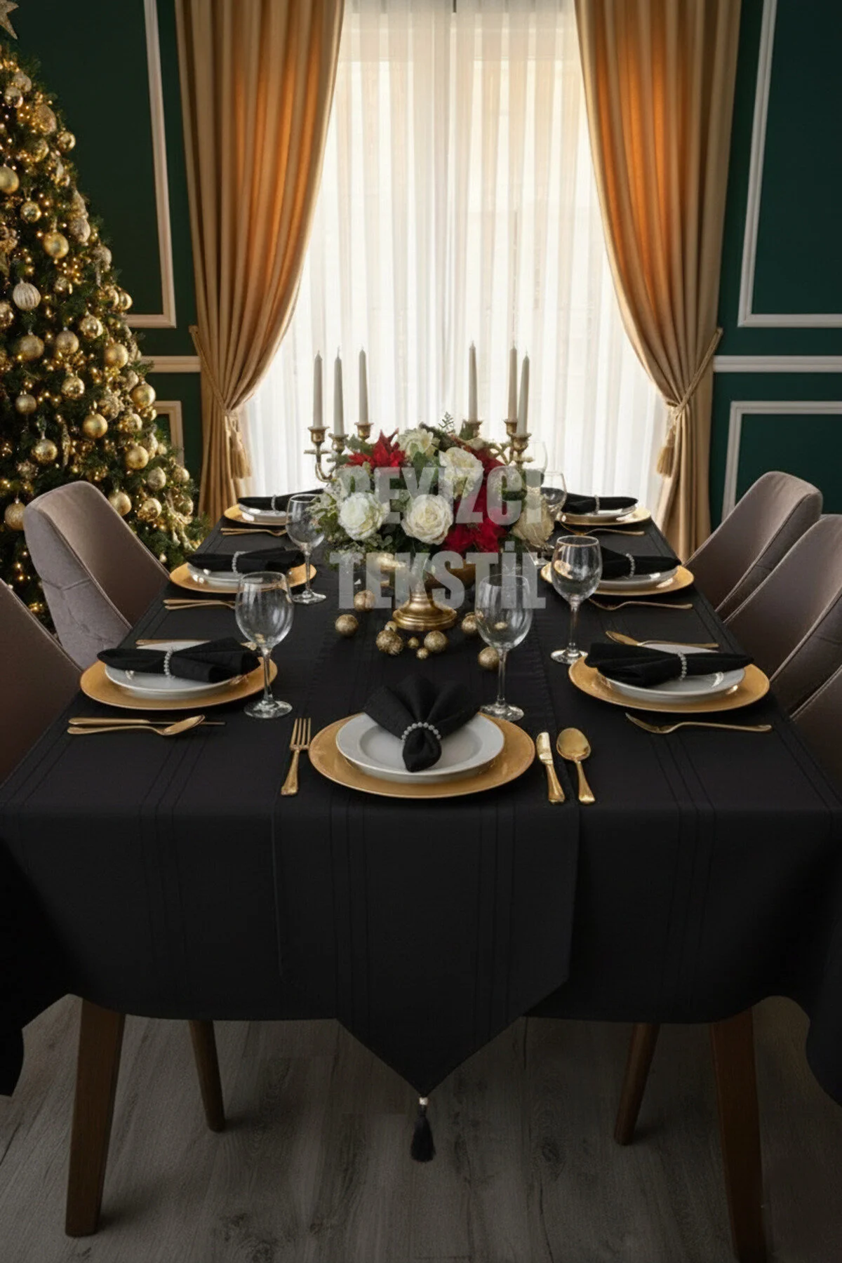 Çizgili 12 Kişilik 26 Parça Masa Örtüsü Siyah