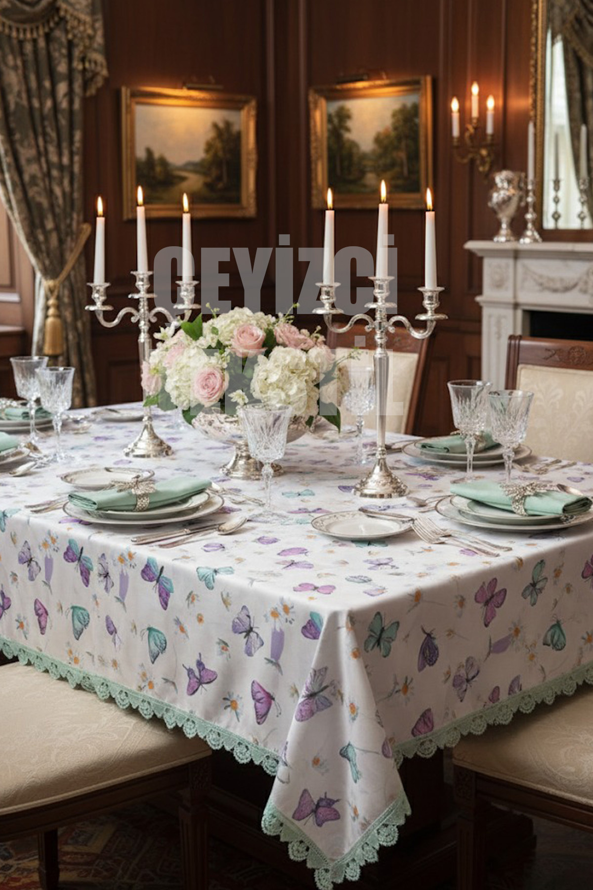 Desenli Dertsiz Leke Tutmaz Dantelli Masa Örtüsü Baskılı Masa Örtüsü