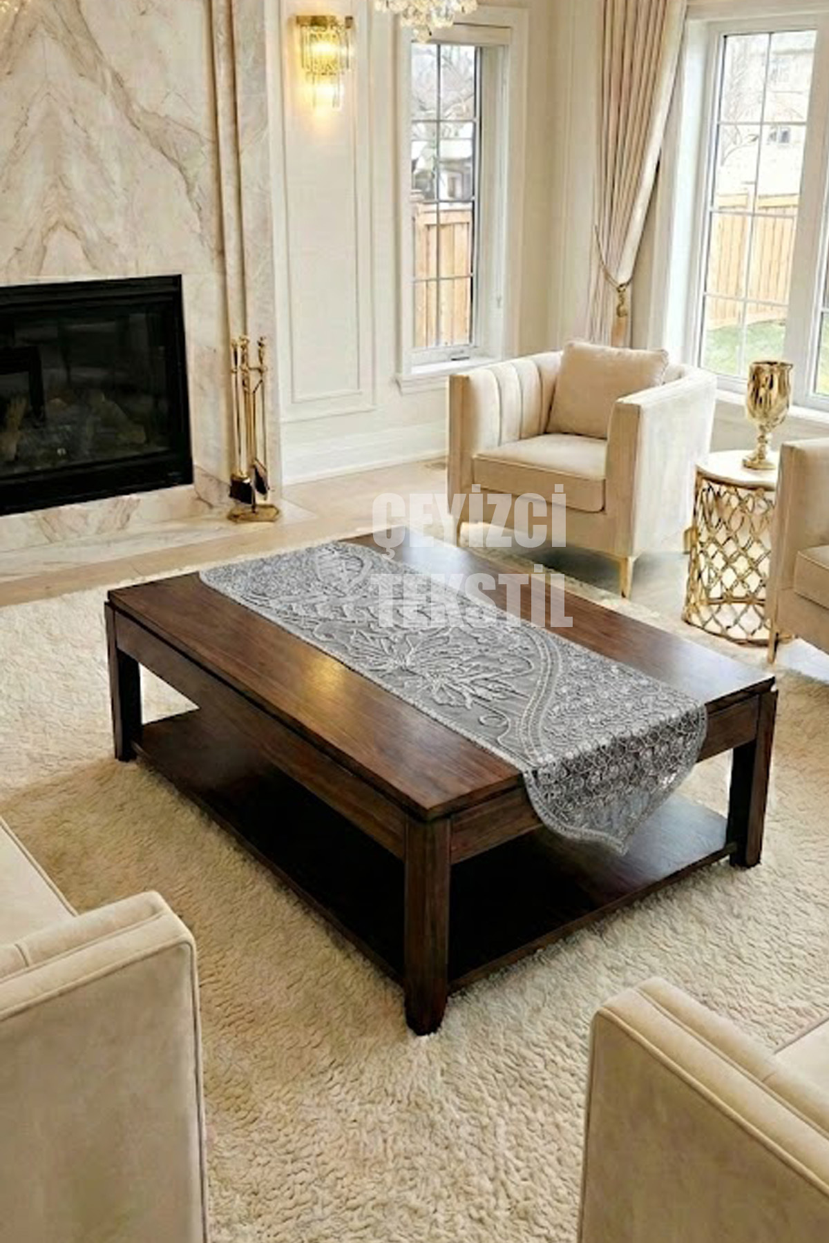 Fransız Dantelli Tek Runner, Kadife Masa Üstü Runner, Masa Örtüsü Runnerı – Gri