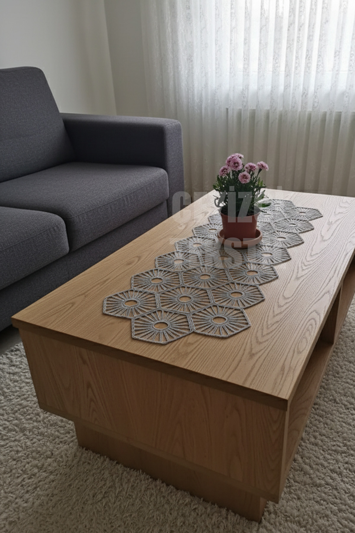 Fransız Dantel Detaylı Tek Runner, Masa Üzerine Runner, Masa Örtüsü Runneri Gri