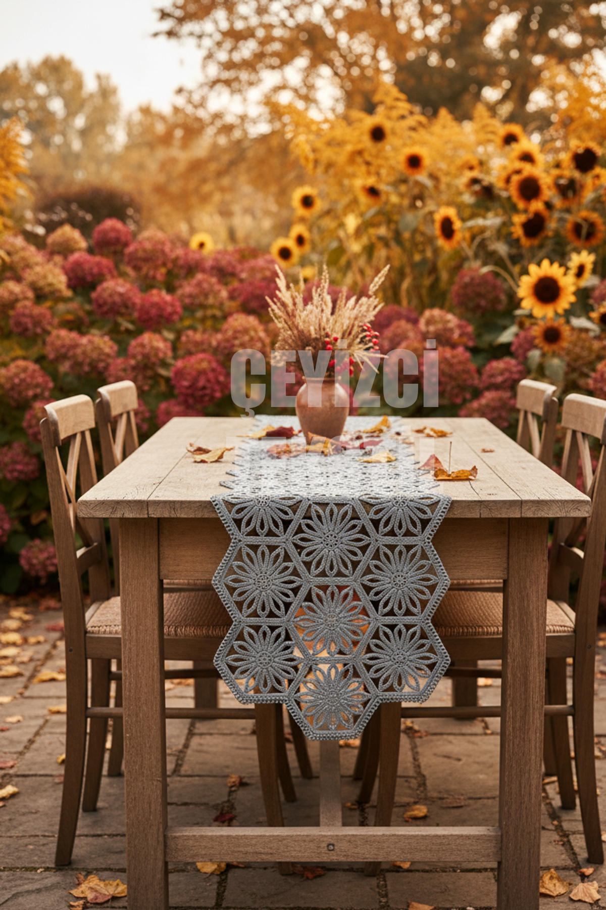 Fransız Dantel Detaylı Tek Runner, Masa Üzerine Runner, Masa Örtüsü Runneri – Gri