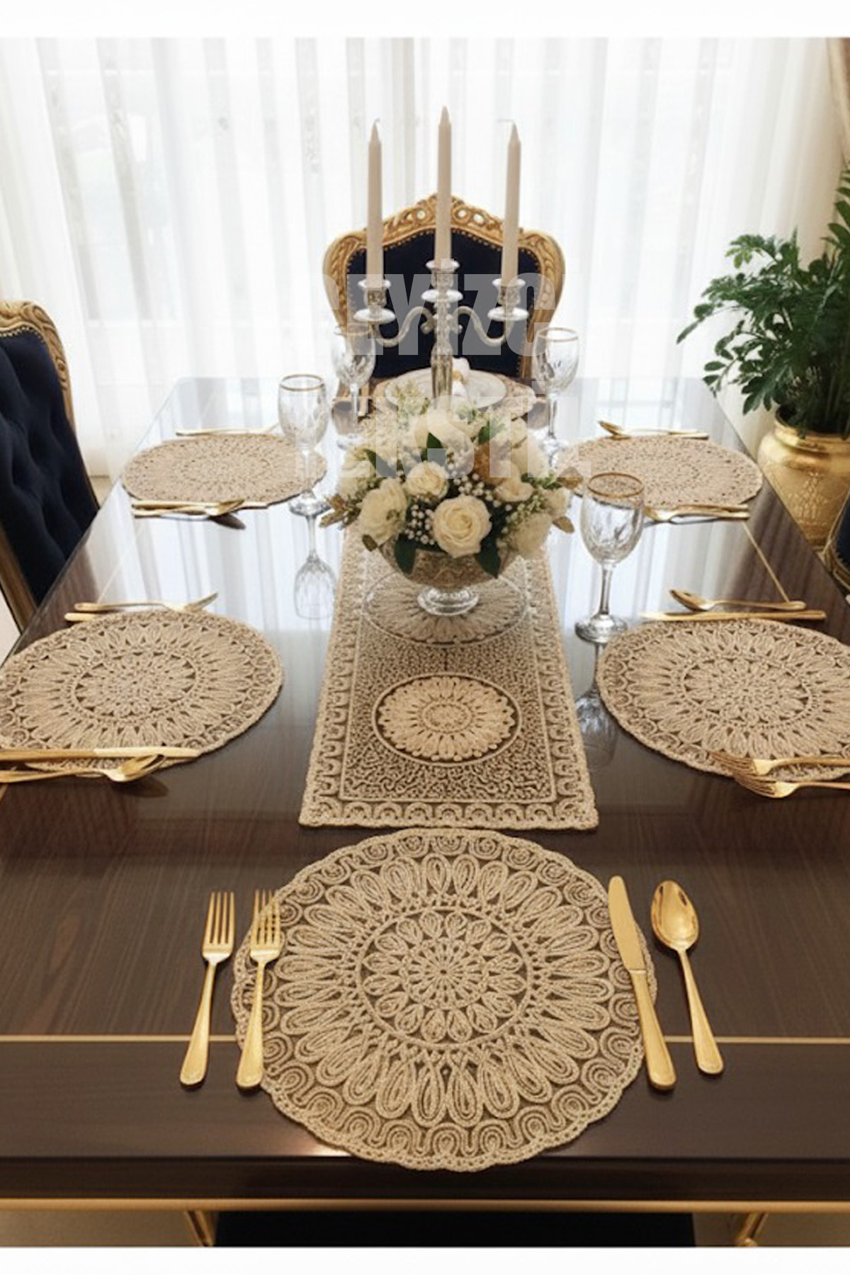 Yüksek kaliteli polyester materyal kullanılarak üretilmiş, uzun ömürlü ve dayanıklı bir yapıya sahiptir; %92 pamuk ve %8 elastan içeriği ile yumuşak dokusu ve esnek yapısı sayesinde konforlu bir kullanım sunar; Yuvarlak tasarımı ile modern ve şık bir görünüm sağlar, masanızın estetiğini artırır;