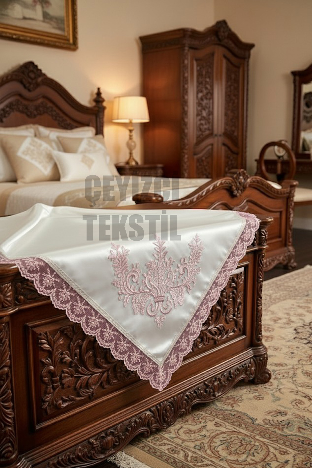 Fransız Güpürlü Işlemeli, Çeyizlik Saten Lüks Bohça, Nişan Bohçası