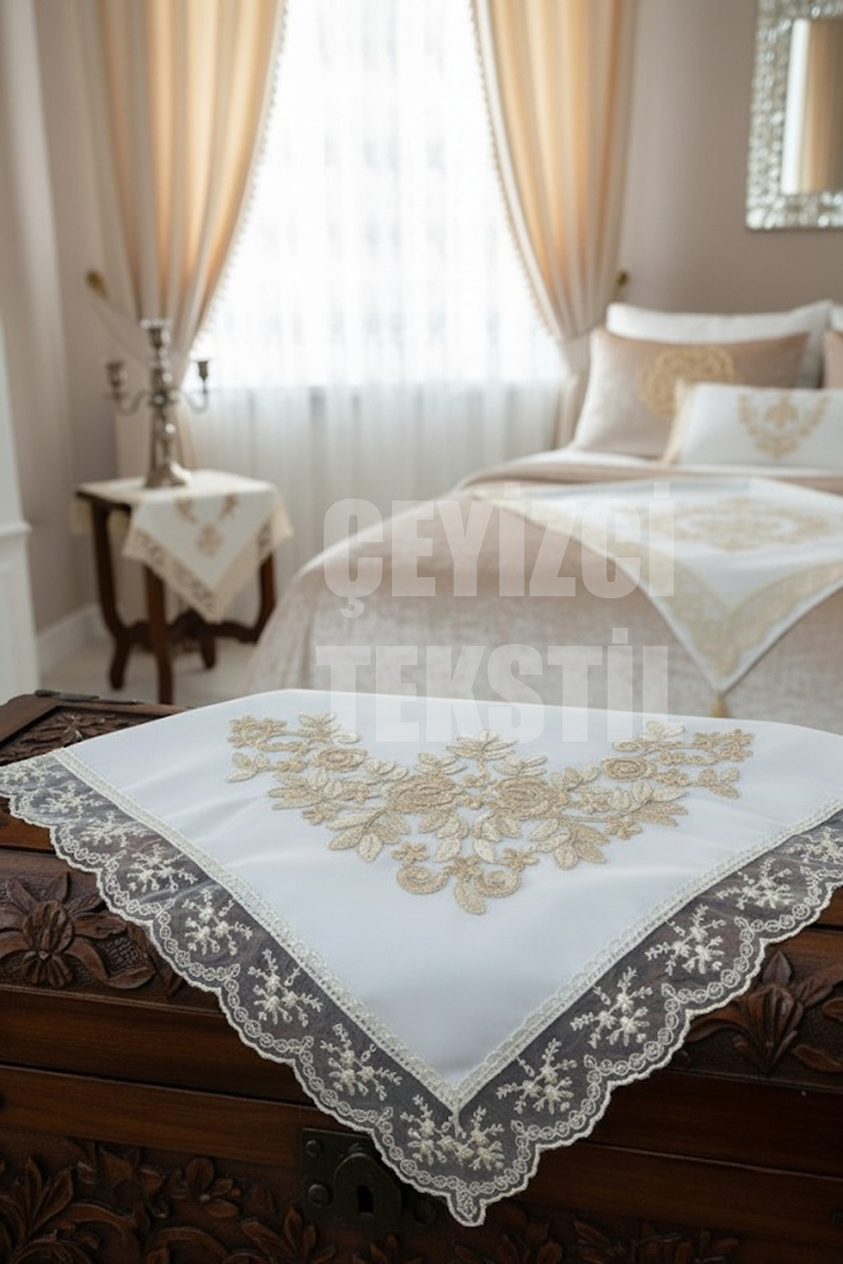 Çeyizlik Bohça, Saten Bohça Dantelli Nişan Bohçası – Krem Kadife Dar Güpürlü