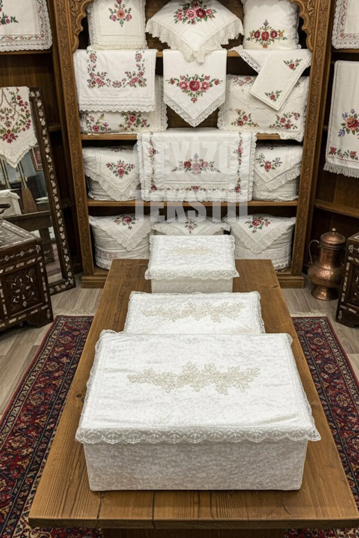 Fransız Güpürlü Işlemeli, Çeyizlik Saten Lüks Bohça, Nişan Bohçası