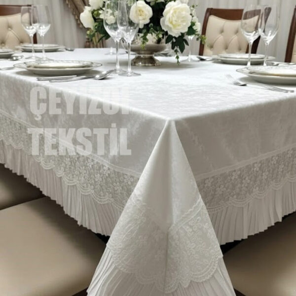 Desenli Dertsiz Leke Tutmaz Dantelli Masa Örtüsü, Çini Desen Masa Örtüsü – Ekru