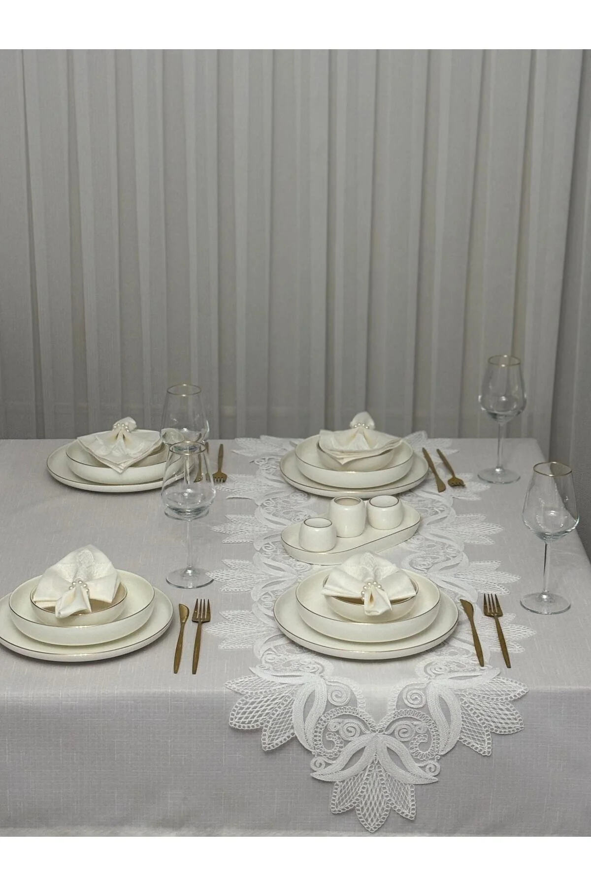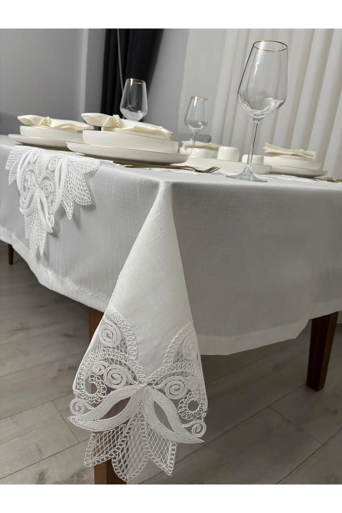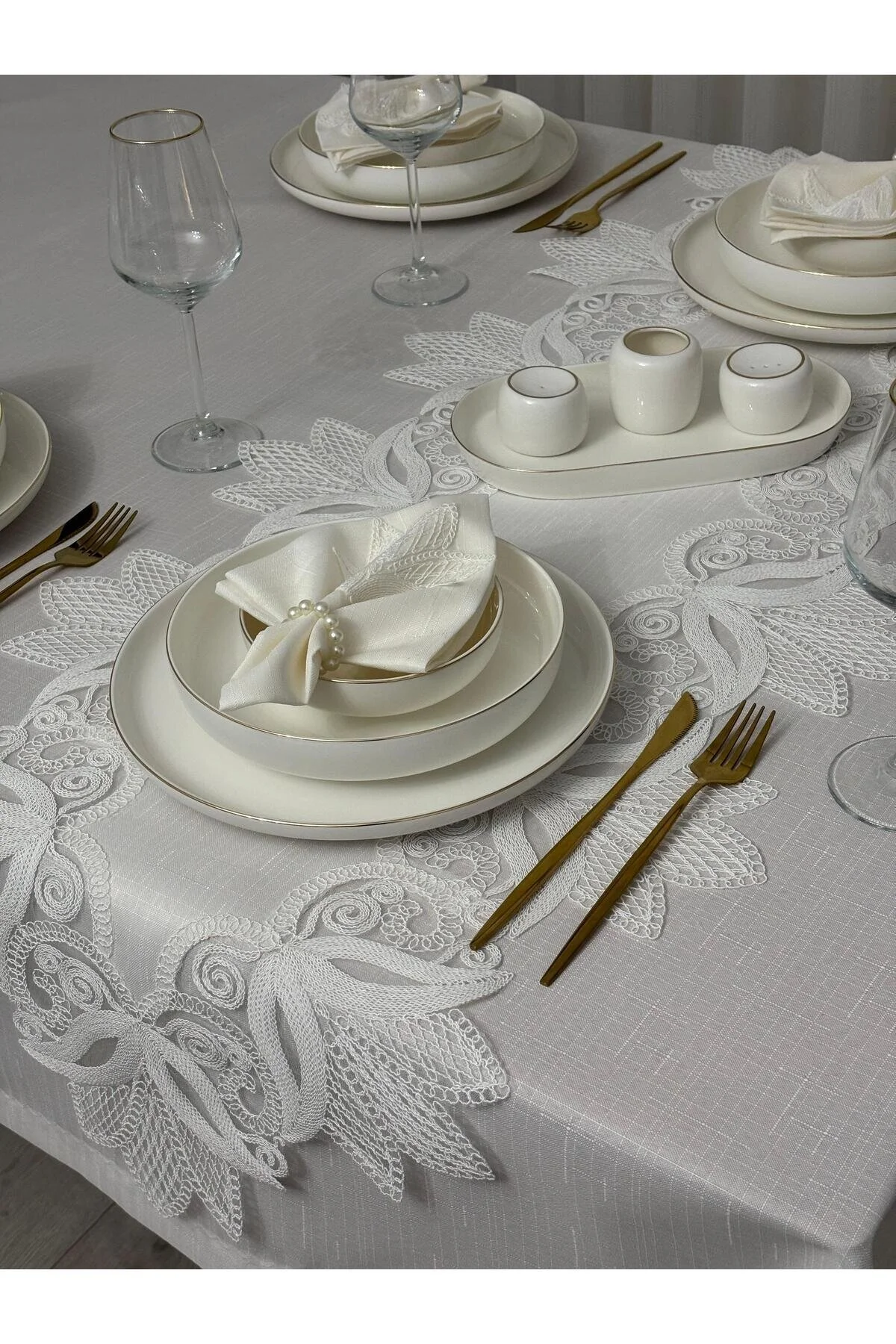Güpür detayları ile zenginleştirilmiş tasarım, masanızın şıklığını artırır