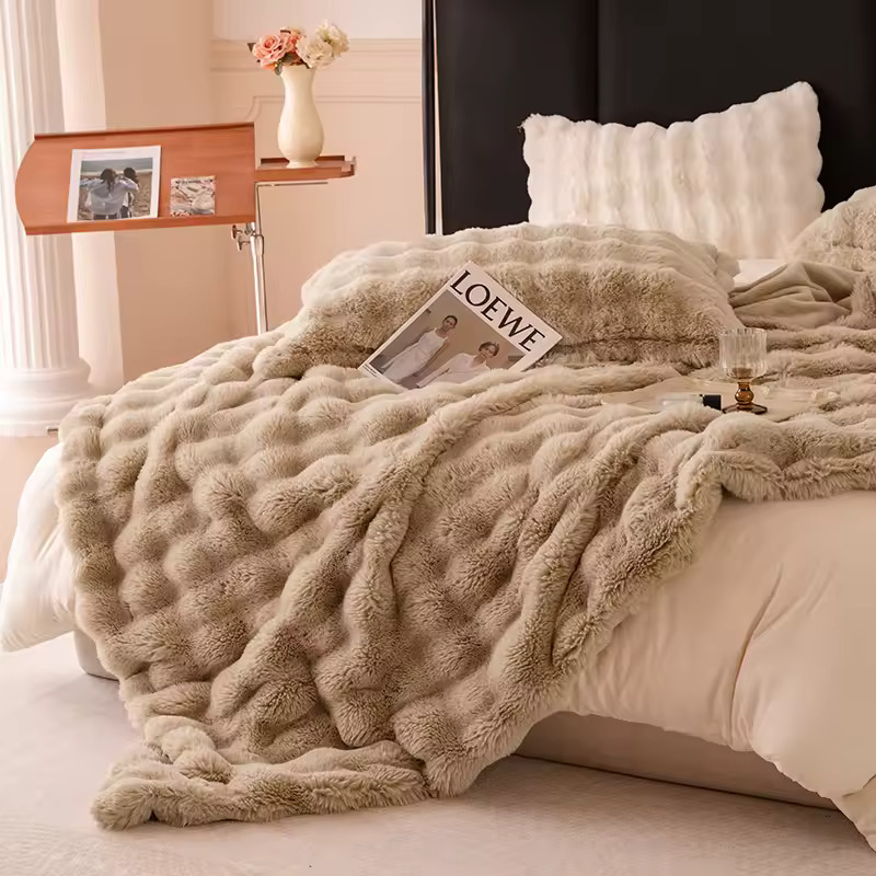 Peluş Koltuk Örtüsü Pofuduk Koltuk Şalı Bubble Polar Koltuk Örtüsü 170x220cm Bej