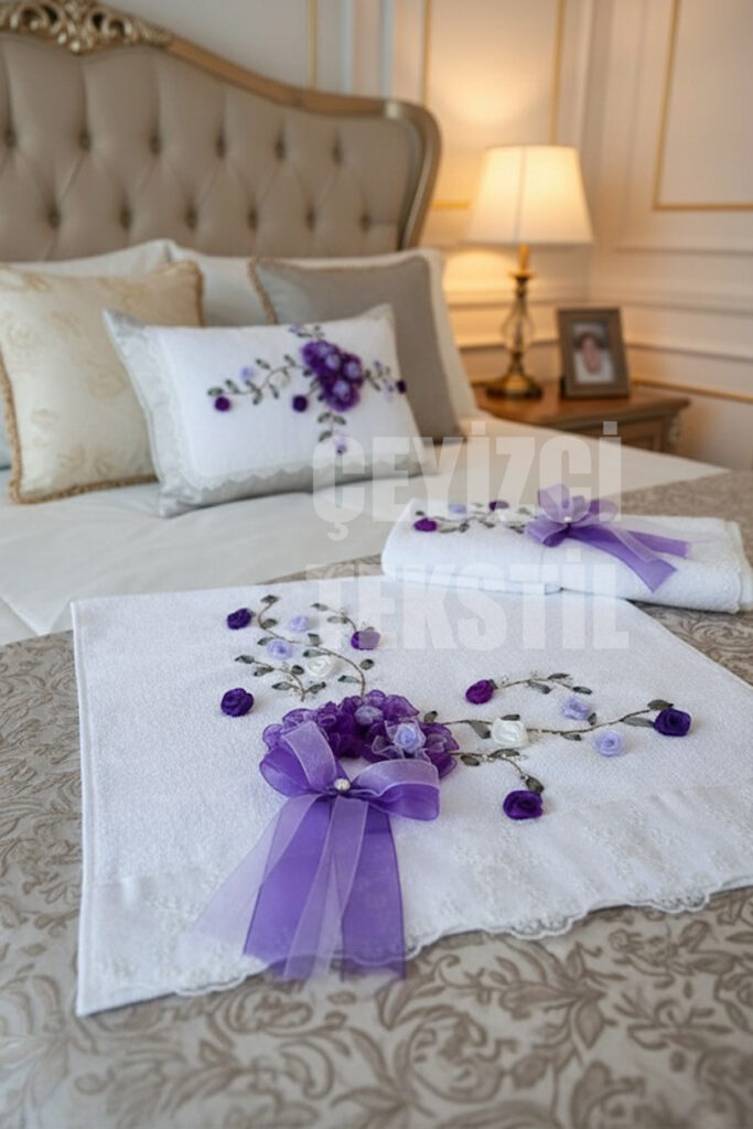 Kadife Çeyizlik Havlu, Nişan Havlusu Kadife Kurdelalı, Kurdele İşi Dantelli Havlu