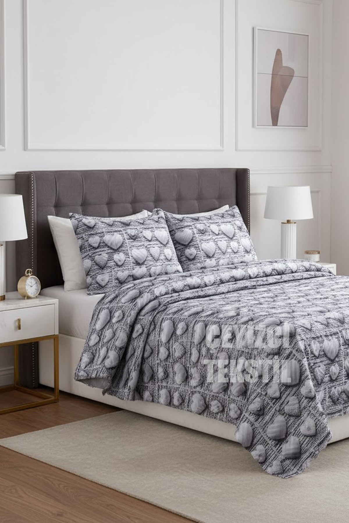 Ultrasonik Kapitoneli 5D Baskılı Çift Kişilik Pike Takımı
